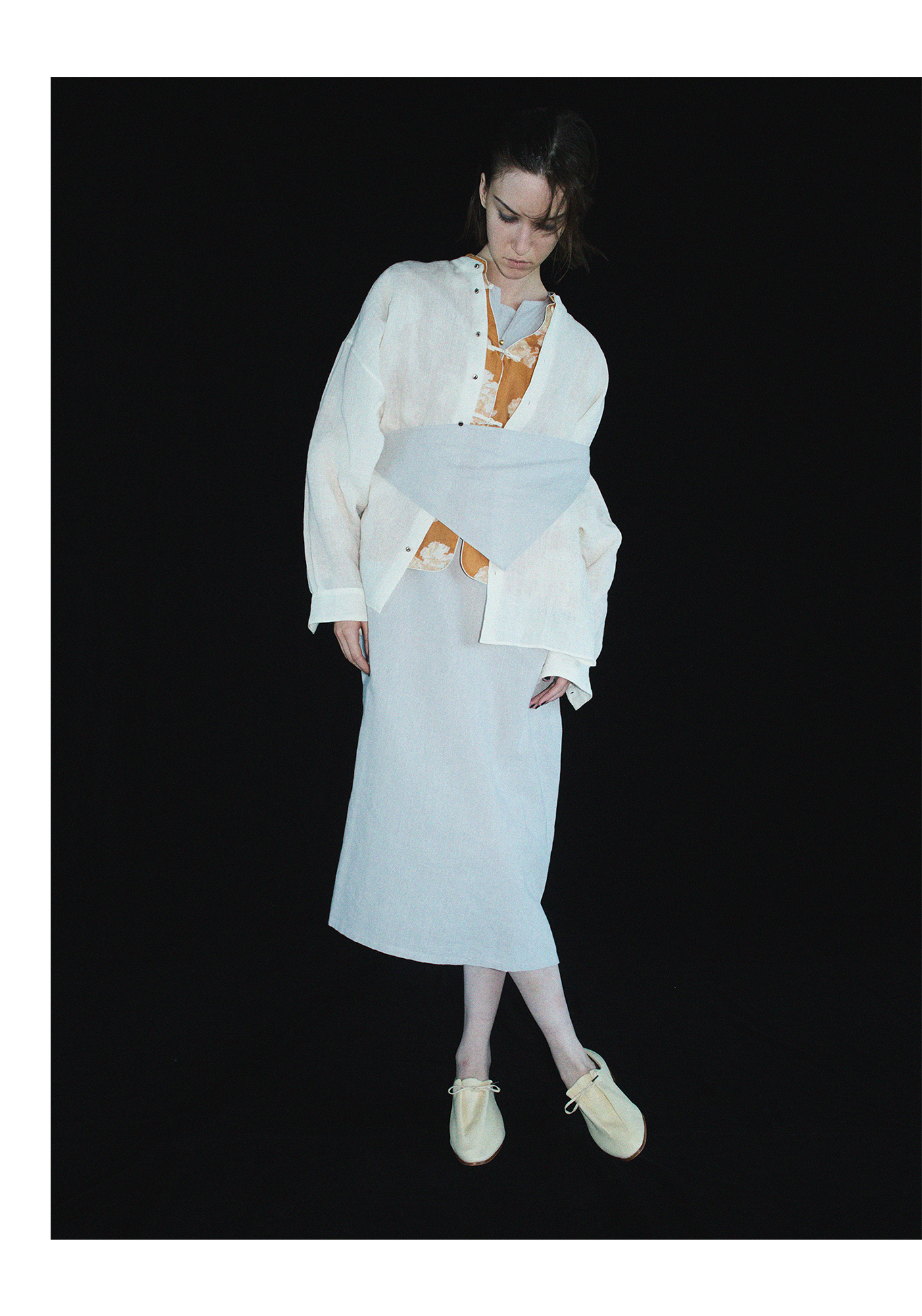 今季のテーマの元となった、Joan Jonasのパフォーマンスは、感じた心を素直に表して踊ったり、演じたり、描いたり、話したりしているように見えて、完璧に完成していない余白の自由が印象深かったため、今回はモデルを、ダンサーさんとと役者さんにお願いをして、そのときの気分やその場で思いつくアイデアをかたちにする緊張感、偶然の発見やハプニングの生々しさを求めて、全体に少し不穏な空気の劇場の舞台をイメ-ジした空間で、それぞれにほとんど⾃由に動き演じてもらいました。シリアスに、コミカルに、激しく、柔らかく、たくさんの表現がうまれた時間でした。